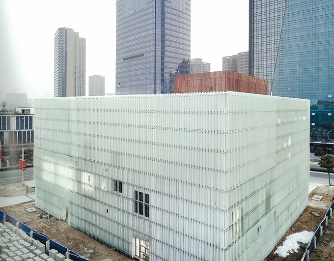 玻璃百叶的透明性将实体的公共性转换成一种视线的公共性,白色彩釉玻璃被定制为300mm宽的长条状构件.按0°、45°、90°这3种角度构成外层表皮,分别对应于内部采光 通风要求不高的区域、对视线有一定限制的区域以及漫步动线对城市在视线上完全打开的区域。